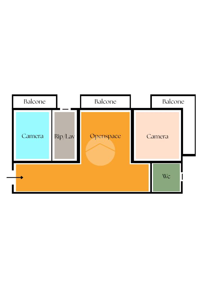 La disposizione interna comprende un openspace che accoglie la zona giorno, una camera matrimoniale, una cameretta, un bagno e un pratico locale adibito a lavanderia/ripostiglio.