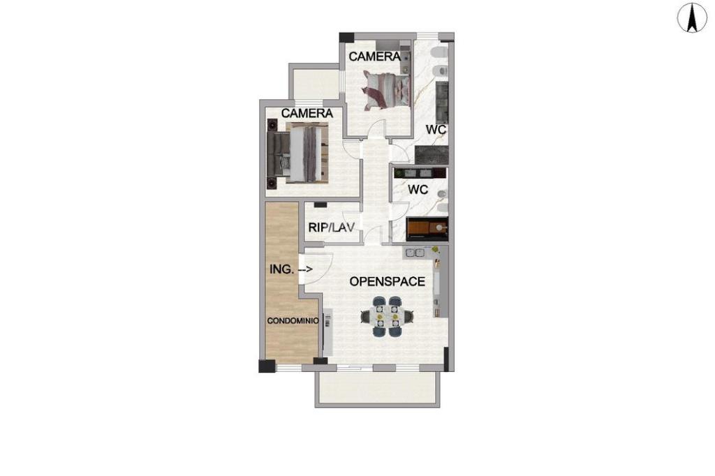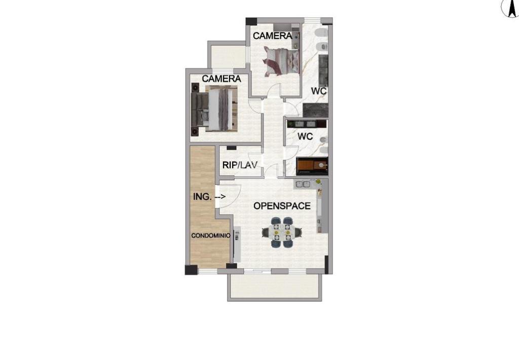Superato l'accesso abbiamo un ampio openspace con affaccio su balcone. Segue la zona notte con camera matrimoniale e bagno di servizio, cameretta e infine il bagno padronale, lavanderia/ripostiglio.