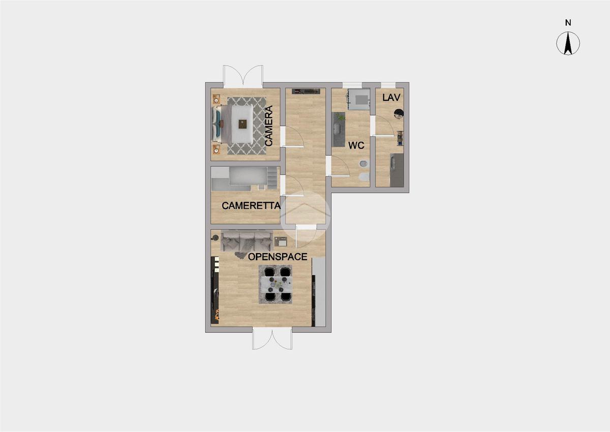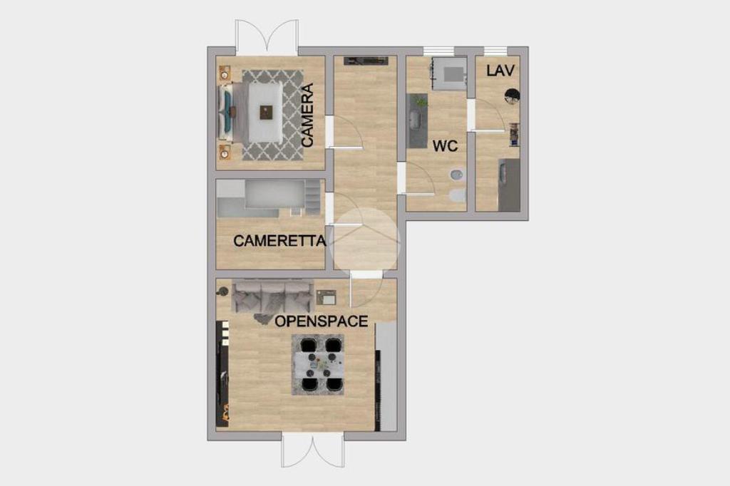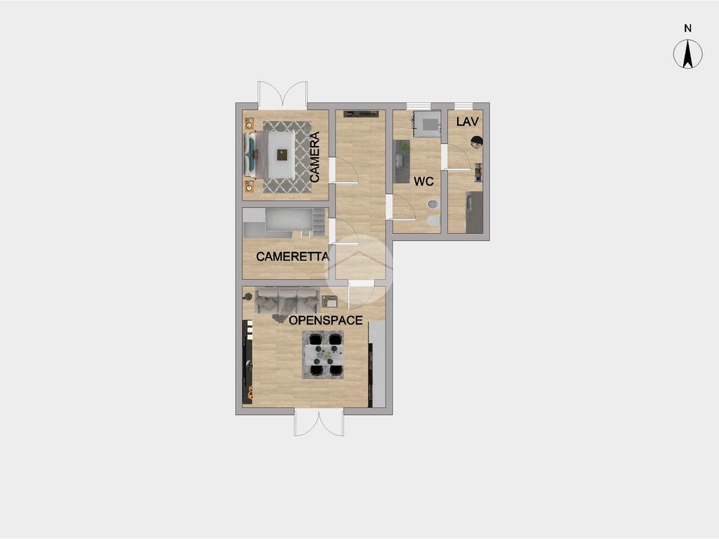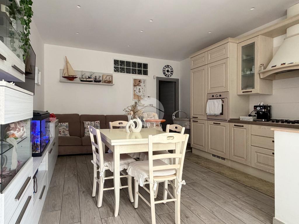 La disposizione interna comprende un ampio openspace che unisce soggiorno e cucina, creando uno spazio conviviale e luminoso. La zona notte è composta da una camera da letto principale e una cameretta, ideali per famiglie o ospiti, oltre a un bagno e lavanderia ben rifiniti.